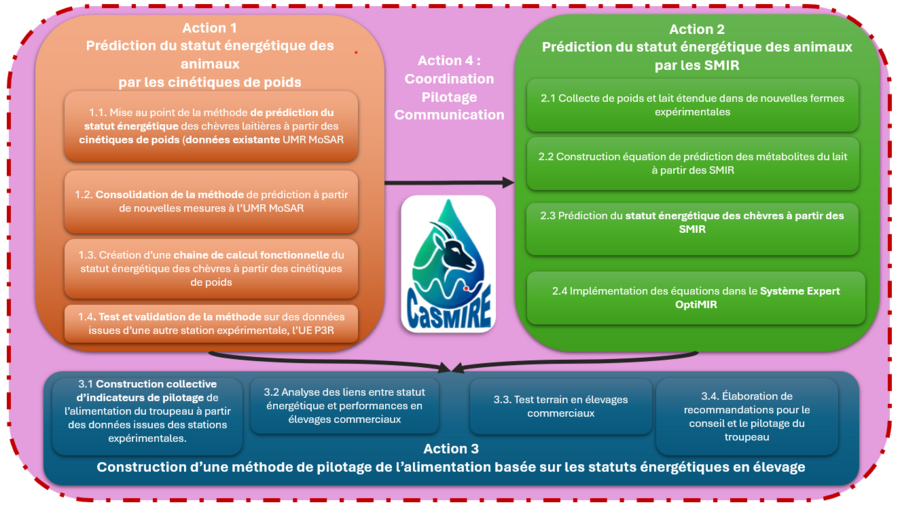 Ils s’appuieront sur des mesures simples, peu couteuses, accessibles et adaptées au contexte des exploitations commerciales, au travers de l’utilisation des spectres moyen infrarouges (SMIR) des laits individuels de chèvres. Pour atteindre ces objectifs, le projet se déroulera en plusieurs étapes. Tout d'abord, une méthode d’estimation du statut énergétique des chèvres sera développée à partir de l’analyse des cinétiques de poids des animaux. Cette méthode sera ensuite testée et validée dans différentes stations expérimentales, où des SMIR des laits individuels seront collectés. Les données issues de ces expérimentations permettront d’élaborer des équations de prédiction du statut énergétique, basées directement sur les SMIR. Ces équations seront ensuite utilisées en fermes commerciales. Enfin, l’interprétation des statuts énergétiques ainsi prédits sera affinée grâce à un travail collaboratif, visant à formuler des recommandations adaptées aux spécificités de chaque élevage, à ses problématiques particulières et à ses modes de conduite.