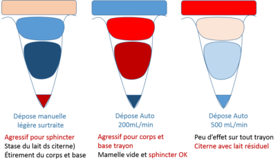 Les mesures de cutimétrie ou de thermographie ont confirmé les effets bénéfiques de ces conditions de dépose sur l'état des trayons en montrant des températures plus basses du corps et du bout du trayon (moindre agressivité de la traite) mais la présence de lait résiduel dans a parte basse des citernes.