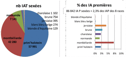 Démarrée en 2009, l’utilisation de la semence sexée monte en puissance surtout pour la race montbéliarde où 5,3% des IA totales et 7,2% des IA premières sont sexées. En races brune, jersiaise et blanc bleu belge, les doses sexées mises en place sont des semences importées, et 75% des IA sexées prim’holstein sont issues des programmes des ES françaises.