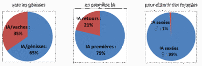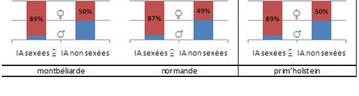 - Après une IA1 sexée, l’IA2 est assurée en semence sexée dans 30 à 40% des cas, l’IA3 est en semence conventionnelle dans 85 à 90% des cas. Les IA sexées ♂ représentent 1% des IA sexées renseignées en races laitières et 23% en races allaitantes.