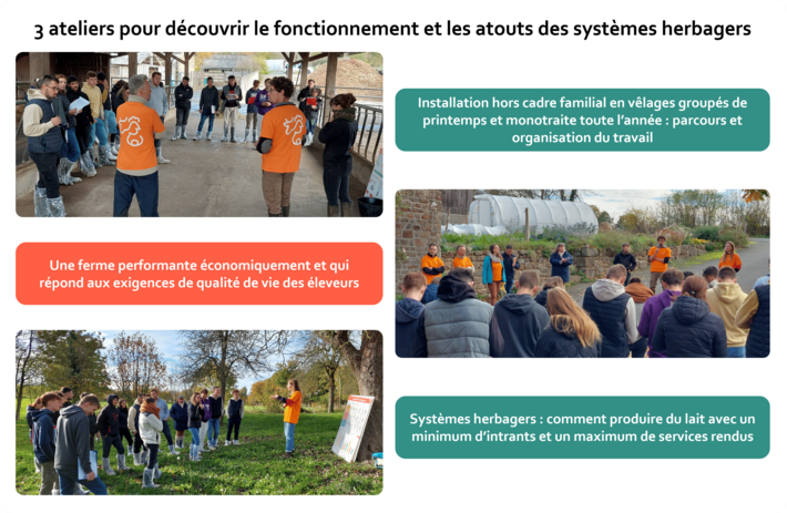 Si cette matinée a permis d'expliquer aux étudiants que les systèmes herbagers sont intéressants pour l'entretien de la biodiversité ordinaire, le stockage de carbone et la qualité de l'eau, l'accent a été particulièrement mis sur le choix de Yoann et Jeanne de s'installer en système herbager, vêlages groupés de printemps et monotraite toute l'année. L'occasion pour les élèves de découvrir une autre organisation du travail et d'appréhender la technicité requise dans ce type de système en terme de gestion de l'herbe et du pâturage mais aussi de reproduction du troupeau. Yoann et Jeanne ont expliqué en toute transparence leurs résultats économiques, encore fluctuants en cette période d'installation et de transition de système, encourageant les élèves à se questionner en profondeur et à varier leurs expériences professionnelles avant de s'installer. Un témoignage inspirant et nécessaire qui a permis aux élèves présents de découvrir le fonctionnement d'un système herbager, pâturant et économe.
