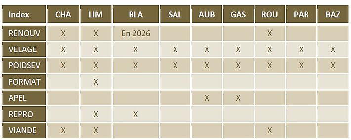Conformément aux souhaits des Organismes de Sélection, 7 nouveaux index font leur apparition de manière concomitante à la mise en place de la nouvelle méthodologie Single-Step. Un index de sélection (RENOUV) et 6 index techniques (VELAGE, POIDSEV, FORMAT, APEL, REPRO et VIANDE). Ce sont donc de 2 à 6 nouveaux index qui sont désormais disponibles dans chaque race en fonction des choix des OS. Leur appropriation et leur valorisation vont progressivement s’organiser au fur et à mesure de leur accès dans les différents outils de terrain et de leur intégration dans les différents programmes de sélection raciaux.