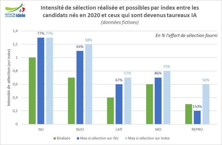 L’un des objectifs des indicateurs est de mesurer l’écart entre ce qui a été réalisé et le maximum qui aurait pu être fait en termes de progrès si la sélection des candidats avait été réalisée exclusivement sur l’Index de Synthèse Unique (ISU) de la race ou sur un autre caractère donné (ex : LAIT).
