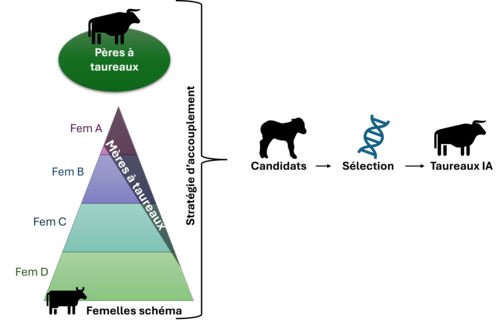Ce schéma présente les différentes populations comparées sur leur niveau génétique et leur consanguinité. Les femelles participant au schéma sont réparties dans différentes classes selon leur valeur génétique. Les différents indicateurs ont été mesurés pour chacune de ces étapes, y compris les intermédiaires et avec la distinction par niveau des femelles schéma.