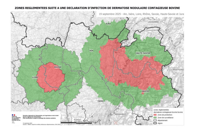 Un nouveau foyer de dermatose nodulaire contagieuse (DNC) a été confirmé le 18 septembre dans le Rhône conduisant à la mise en place d'une deuxième Zone Réglementée.