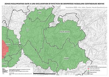 A propos de la première zone réglementée (ZR1). Cette zone a été mise en place suite à la détection d'un premier foyer le 29 Juin en Savoie, elle a ensuite évolué en fonction des nouveaux foyers confirmés. Aujourd'hui, elle s'étend sur des communes de Savoie, de Haute-Savoie, de l'Ain, de l'Isère, du Jura et déborde sur la Suisse et sur quelques communes en Italie. Aucun nouveau foyer n'a été confirmé depuis le 6 septembre sur cette zone ainsi les communes de la ZR1 en zone de protection sont passées samedi 4 octobre en zone de surveillance. Malgré tout, le respect des mesures de biosécurité et notamment les restrictions de mouvements restent de vigueur.