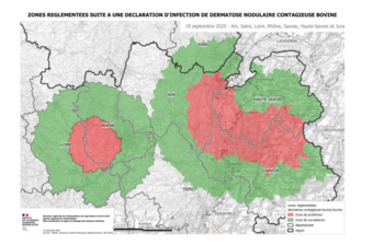 - Une instruction de la DGAL publiée le 18-08-2025 (cf lien ci dessous) précise les conditions de dérogations aux mouvements des bovins. Cette instruction définit une nouvelle zone au sein de la Zone de Protection qui est la Zone de Coeur de Protection (constituée de communes infectées et des communes proches de communes infectées). Cette instruction a été modifiée le 4 septembre et le 17 septembre. Les modification du 4 septembre concernent essentiellement les conditions spécifiques aux mouvements pour l'élevage (changement de pré, rentrée en bâtiment, retour d'estive, vaches prêtes à vêler ou venant de vêler, vaches malades ou blessées, veaux à destination d'un atelier d'engraissement). Les modifications du 17 septembre concernent essentiellement les mouvements intra ZR et vers la ZR.