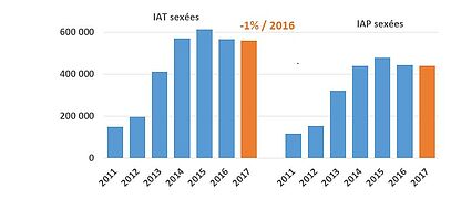 Depuis trois ans l'activité insémination en semence sexée paraît stabilisée autour de 600 000 IA, premières et retours. En 2017, on a enregistré 558 906 IA, soit 7,9% de l'activité IA totale. Le nombre d'IA sexées a baissé (-1% par rapport à 2016), un peu plus que l'activité insémination(-0,2%).