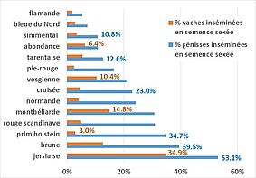L’utilisation de la semence sexée diffère selon les races et selon la parité. Elle cible davantage les génisses, plus du tiers d'entre elles dans certaines races. C’est variable pour les vaches selon les races : là où la fertilité des vaches est plus faible et leurs risques de vêlages difficiles peu élevés, comme en prim’holstein, 3 % des vaches sont inséminées en semence sexée. Là où la fertilité est plutôt assurée, et où les vêlages sont moins faciles, comme en montbéliarde, près de 15% des vaches sont inséminées. En race jersiaise où la naissance d’un mâle n’est pas souhaitée, 53% des génisses et 35% des vaches sont inséminées avec de la semence sexée.