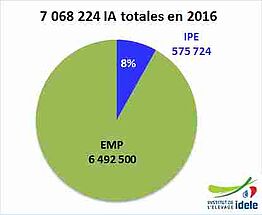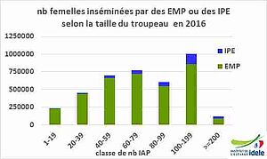 Le nombre total d’IA déclarées par ces éleveurs via les EdE (au 15/04/2017) est 575 224 dont 325 384 IA premières (IAP). L’évolution de l’activité est croissante : +12%/2015. L’activité IPE augmente de 50 000 à 80 000 IA par an depuis 2008.