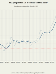 Afin de disposer d’indicateurs plus récents, le CNIEL a demandé à l’Institut de l’Elevage de proposer une méthode d’estimation de leur évolution en année N (2024). Celle-ci met notamment en œuvre des sources officielles d’indexation des charges parmi lesquelles l’IPAMPA, le SMIC, l’indice national des fermages, le taux de rémunération du livret A… Les indices d’estimation pour l’année 2025 sont présents dans le tableau de bord du CNIEL.