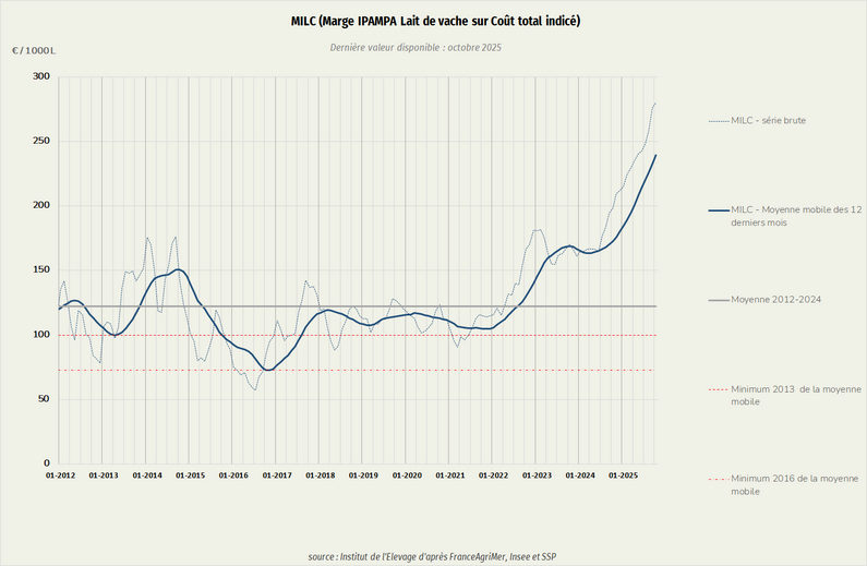 A compter de juillet 2025 (données de mai 2025), la Marge IPAMPA Lait de vache sur Coût total indicé (MILC) est diffusée en base 2020 (voir détails sous le graphique), à la suite du rebasement de l’IPAMPA Lait de vache en base 2020 (voir la méthode de calcul IPAMPA 2020)