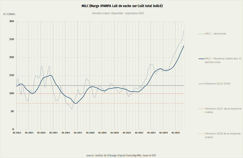 A compter de juillet 2025 (données de mai 2025), la Marge IPAMPA Lait de vache sur Coût total indicé (MILC) est diffusée en base 2020 (voir détails sous le graphique), à la suite du rebasement de l’IPAMPA Lait de vache en base 2020 (voir la méthode de calcul IPAMPA 2020)