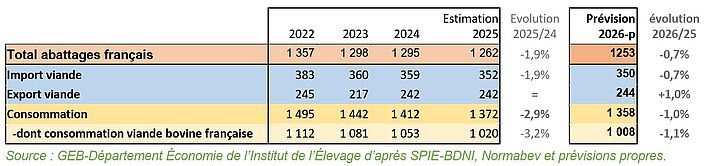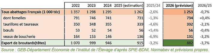 Les exportations de broutards, malgré les interdictions localisées liées à la propagation de la DNC, ont pour leur part largement moins baissé que l’année précédente, à « seulement » - 3,2 % en 2025.Nous estimons que ce mouvement va se poursuivre en 2026 et que la baisse des disponibilités, particulièrement élevée sur cette cohorte touchée par les épizooties, va se répercuter non seulement sur les exportations de broutards, attendues en baisse de -3,7 % (mâles et femelles confondus), mais aussi sur la production de jeunes bovins de type viande, autour de -2,6%.