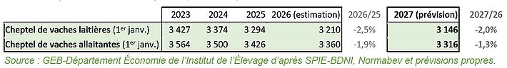 Les effectifs renforcés de génisses, allaitantes notamment, permettent d’attendre un léger rebond des abattages de femelles en 2026, ainsi qu’une atténuation de la décapitalisation