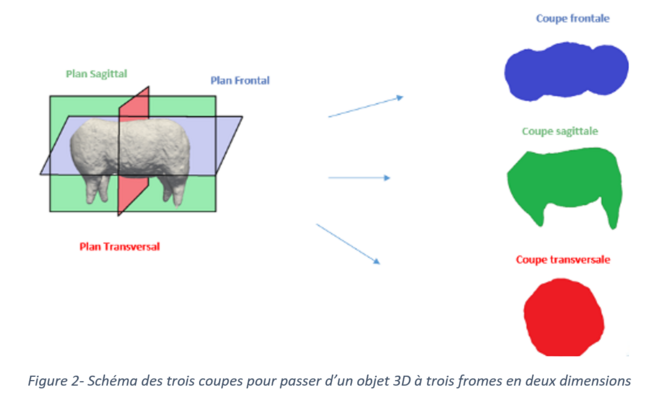 Ces six indicateurs sont calculés ou extraits directement depuis l’objet 3D. Afin d’ajouter d’autres paramètres d’entrée à nos modèles, il est possible de revenir à des formes en deux dimensions. En se plaçant au centre de l’objet 3D, nous réalisons trois coupes sous trois angles différents, en suivant l’axe X (coupe transversale), l’axe Y (coupe frontale) et l’axe Z (coupe sagittale). Nous obtenons trois formes en 2 dimensions sur lesquelles nous calculons la surface et le périmètre (figure 2). Cette méthode permet d’incorporer six indicateurs supplémentaires au modèle et d’ajouter des informations plus précises sur le gabarit de l’animal.
