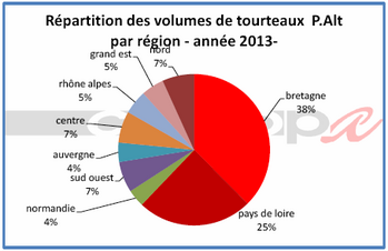63% des tourteaux dont le volume global consommé par le modèle est de 5,4 millions de tonnes sont consommés dans deux régions majeures : Bretagne et Pays de la Loire. Le reste se répartit assez équitablement entre régions.