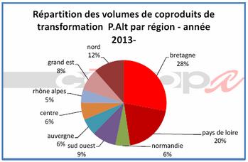 Si le taux moyen d’incorporation des coproduits dans les aliments composés est de 40% en moyenne en France en 2013, les situations varient fortement entre le Grand Est et la Normandie qui atteignent au moins 60% d’incorporation, et la Bretagne où 33% seulement des matières premières utilisées sont des coproduits.