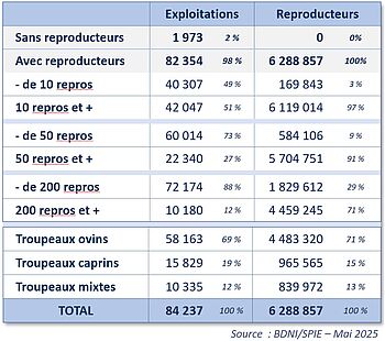 En 2025, 84 237 exploitations ovines et caprines détenant 6,29 millions de reproducteurs ont déclaré un recensement (données BDNI, mai 2024). Parmi ces exploitations, on dénombre :