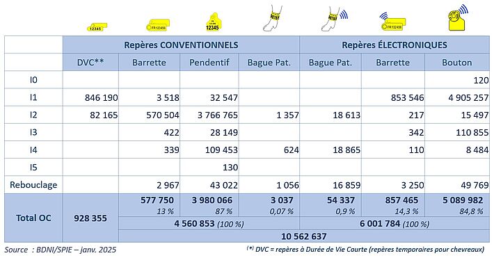 Les exploitations détenant des ovins et des caprins ont commandé 10,6 millions de repères d'identification (tous formats confondus) et 930 000 de repères temporaires pour les chevreaux (DVC).
