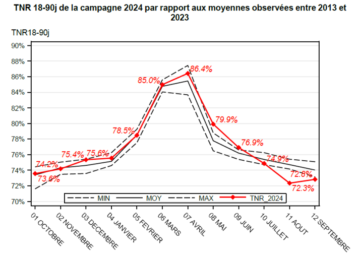 En proportion, août 2024 a connu une baisse importante (-11,5%) rattrapé en partie sur le mois de septembre 2024 qui lui a aumenté de +5,6% par rapport à la campagne précédente.
