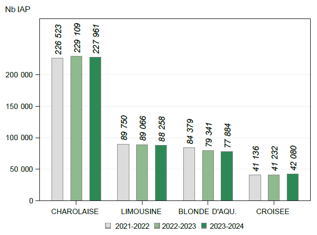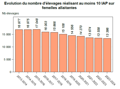 Sur les dernières années, la baisse semble ralentir avec un volume d'IAP constant entre 2023 et 2024. Les IAP sont stables et les IAT en hausse sur la dernière campagne ; cela amène à s'interroger sur les réussites à la reproduction.