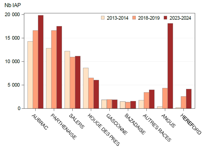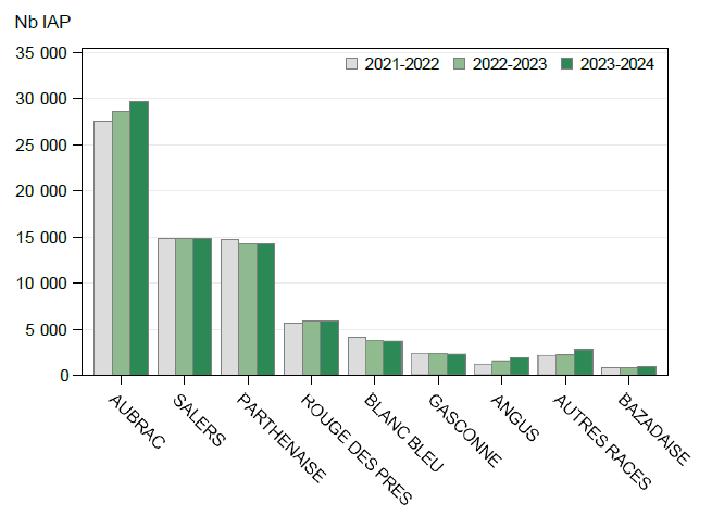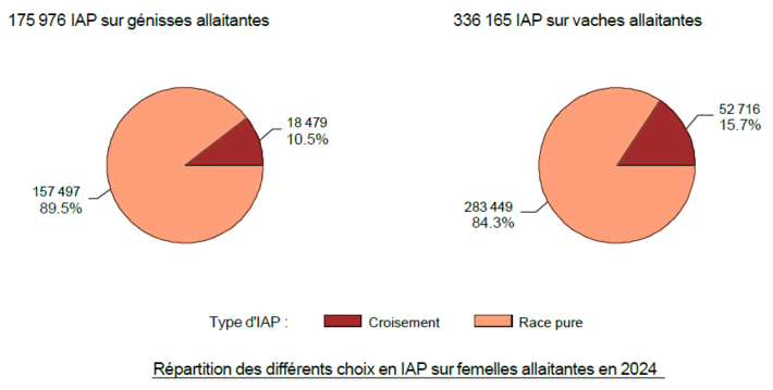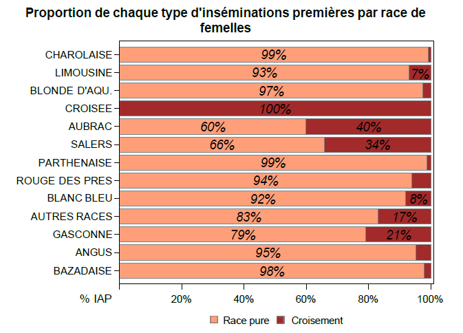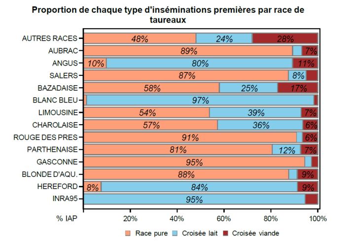 A l'échelle nationale, toutes races confondues, 86% des IAP sur femelles allaitantes ont été réalisées en race pure. Quelques races sont utilisatrices du croisement avec d'autres races de taureau comme l'Aubrac (40%) ou la Salers (34%).