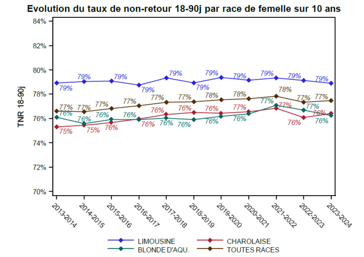 Le taux de non-retour 18-90j est un indicateur qui permet de voir si les inséminations premières ont été suivies, ou non, dans l'intervalle de 18j à 90j suivant cette IAP. Cet indicateur ne prend donc pas en compte si les retours ont été effectués par un taureau de monte naturelle. Il surestime le taux de conception que l'on pourrait mesurer, mais il reste un bon indicateur. Les résultats de taux de non-retour présentés dans cette partie ne concernent que les inséminations premières en semence conventionnelle.