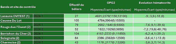 D’autres races se sont engagées dans cette voie. Elles utilisent le même protocole en adaptant les doses de larves en fonction des spécificités de la race. Les résultats (Tableau 2) illustrent la diversité phénotypique à la fois en terme de moyenne mais en terme de variabilité intra-bande des OPG2. L’évolution du niveau d’hématocrites dans le sang durant la seconde infestation est elle aussi variable, même si la baisse est constatée dans toutes les races et bandes.