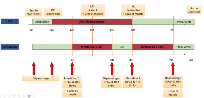 Dans les programmes de sélection ovin allaitant, la station de contrôle individuel (SCI) est l’outil central de sélection et de diffusion des jeunes béliers de chaque génération. Chaque année, 2600 jeunes béliers, majoritairement issus d’accouplements raisonnés et sélectionnés sur leur ascendance, sont contrôlés et évalués sur leurs aptitudes bouchères (Croissance, Muscle et Gras). Le protocole contrôlé et standardisé de phénotypage de la résistance au parasitisme gastro-intestinal est conduit dans le même temps que la SCI et sur les mêmes animaux. Cinq races ont mis en œuvre ce protocole : la Blanche du Massif Central dans le cadre de PhenoPasto, mais aussi la Causses du Lot, la Lacaune OVITEST, la Rouge de l’Ouest et la Berrichon de l’Indre. Ce protocole strict s’appuie sur 2 infestations de doses de larves Haemoncus Contortus adaptées à chaque race. Des mesures d’excrétion d’œufs par grammes de fèces (OPG) sont réalisées en lot (avant) et individuellement (après) pour chaque infestation. En complément, des prises de sang permettent de suivre le niveau d’hématocrite individuel. Ce protocole est identique pour des SCI de 8 ou 6 semaines, avec une première infestation débutant en même temps que la SCI pour le protocole 6 semaines.