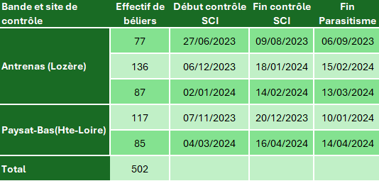 Entre juin 2023 et avril 2024, ce sont 502 jeunes béliers qui ont été phénotypés conjointement pour les aptitudes bouchères et la résistance au parasitisme (Tableau 1). Deux sites supports sont concernés : Antrenas en Lozère et Paysat-Bas en Haute-Loire.