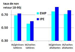 Les taux de non retour 18-90j observés par type de femelle (génisse/vache, laitière/allaitante) donnent des résultats en apparence meilleurs pour les éleveurs IPE par rapports aux résultats des EMP « historiques », surtout en races allaitantes. | ![]() |