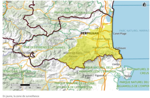 La confirmation le 3 octobre 2025, d'un foyer en Espagne en Catalogne, a conduit les espagnols à mettre en place une Zone Réglementée. Un deuxième foyer a été confirmé le 6 octobre et un troisème le 8 octobre. Ces foyers étant situé proximité de la frontière française des communes (93 communes) du département des Pyrénées Orientales sont de fait incluses dans la zone de surveillance (ZR3).