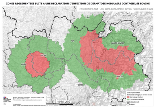 - Une instruction de la DGAL publiée le 18-08-2025 (cf lien ci dessous) précise les conditions de dérogations aux mouvements des bovins. Cette instruction définit une nouvelle zone au sein de la Zone de Protection qui est la Zone de Coeur de Protection (constituée de communes infectées et des communes proches de communes infectées). Cette instruction a été modifiée le 4 septembre et le 17 septembre. Les modification du 4 septembre concernent essentiellement les conditions spécifiques aux mouvements pour l'élevage (changement de pré, rentrée en bâtiment, retour d'estive, vaches prêtes à vêler ou venant de vêler, vaches malades ou blessées, veaux à destination d'un atelier d'engraissement). Les modifications du 17 septembre concernent essentiellement les mouvements intra ZR et vers la ZR.