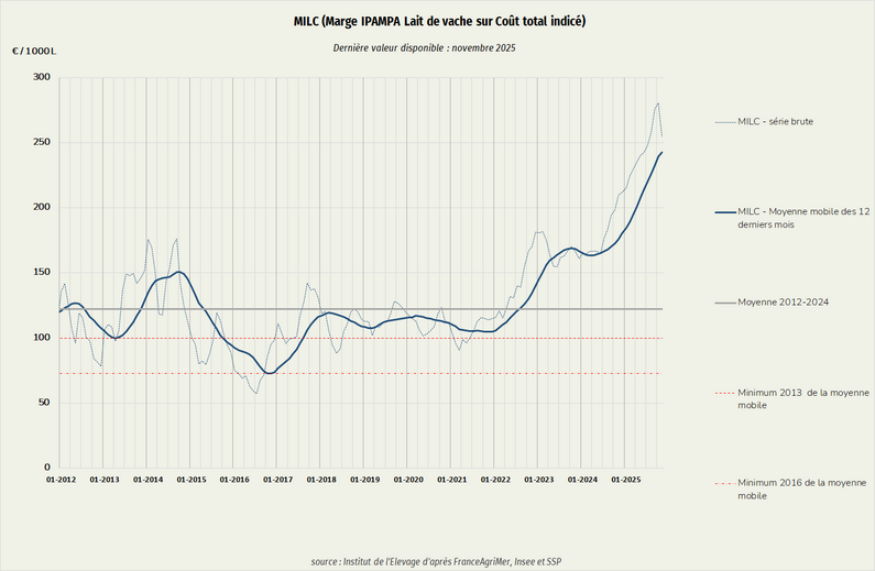 A compter de juillet 2025 (données de mai 2025), la Marge IPAMPA Lait de vache sur Coût total indicé (MILC) est diffusée en base 2020 (voir détails sous le graphique), à la suite du rebasement de l’IPAMPA Lait de vache en base 2020 (voir la méthode de calcul IPAMPA 2020)