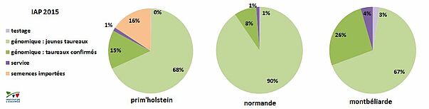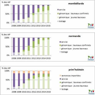 En 2015, dans la race normande, ce sont en majorité (90%) des IA de jeunes taureaux évalués en génomique sans avoir de filles qui sont utilisés pour renouveler les troupeaux. Les IA de cette catégorie représentent 67% en montbéliarde, où 15% sont faites par des taureaux en confirmation sur descendance, dont les premières filles viendront fiabiliser les index à leur entrée en production.