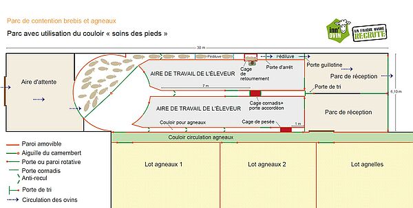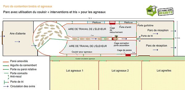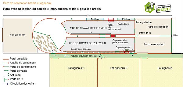 Suggestion : l'aire de travail de l'éleveur peut être aménagée en aire de tonte en installant une porte de tonte dans le couloir.