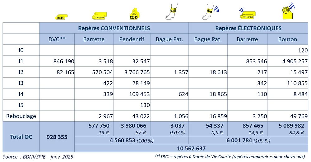 Les exploitations détenant des ovins et des caprins ont commandé 10,6 millions de repères d'identification (tous formats confondus) et 930 000 de repères temporaires pour les chevreaux (DVC).