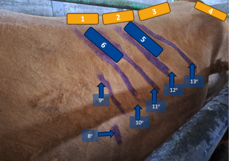 A partir des pratiques internationales, de discussions avec IMV Imaging et de pré-essais, 6 sites de mesures sur l’animal ont été retenus pour réaliser une échographie à sonde profonde :