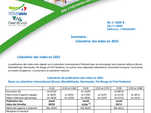 Pour rappel: Le calendrier de publication des index 2021 est disponible dans la note IBL2020-8. Les races concernées par cette publication sont: l'Abondance, la Simmental, la Tarentaise, la Vosgienne et les autres races régionales ainsi que les femelles des grandes races.